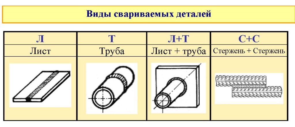 При сварке различают следующие виды свариваемых деталей лист — Л (Р), труба — Т (Т), стрежень — (С) и их сочетания между собой лист с трубой (Л + Т), трубы с отводом (Т + О), трубы с трубой через муфту (Т + М + Т), лист со стержнем (Л+С).