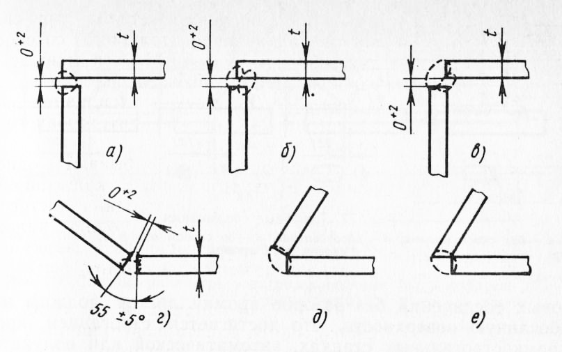 Типы сварных соединений: а) стыковое; б) угловое; в) тавровое; г) нахлесточное; д) торцевое