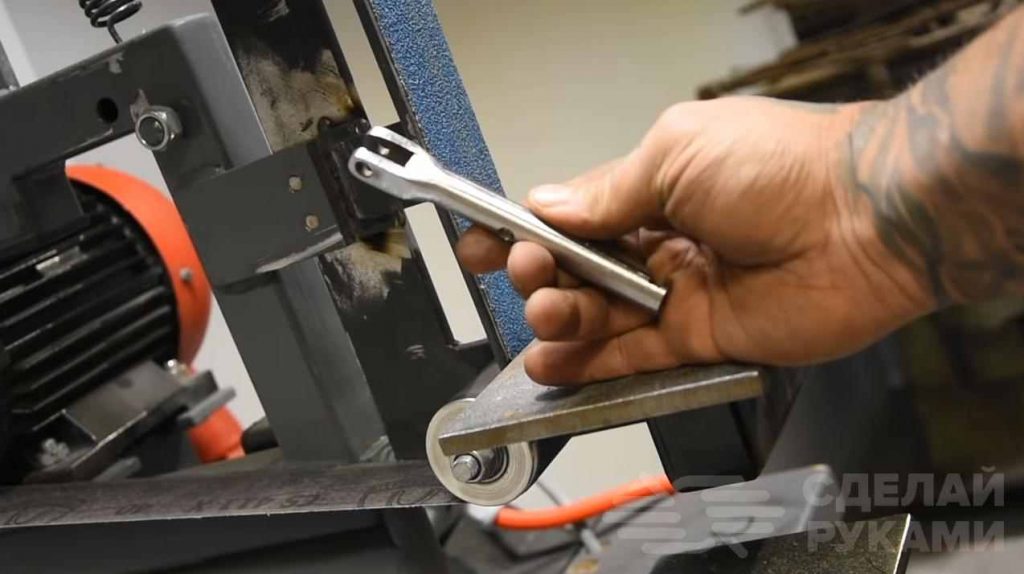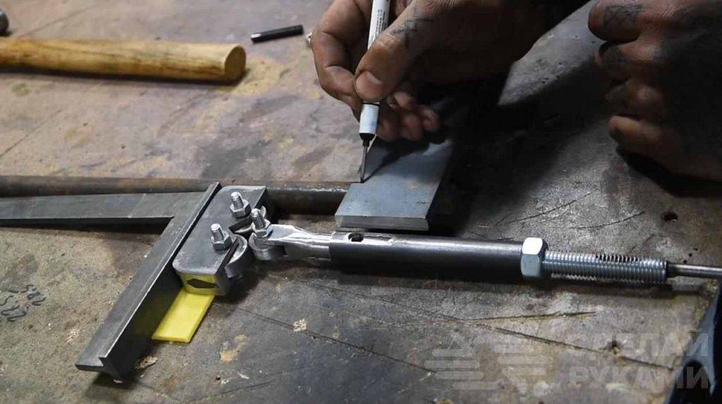 Далее из небольших кусков металла делается посадочное место под третий накатный ролик, который надо приварить к стальному прутку. На другой стороне кругляка с помощью болгарки делается прорезь под шпильку.