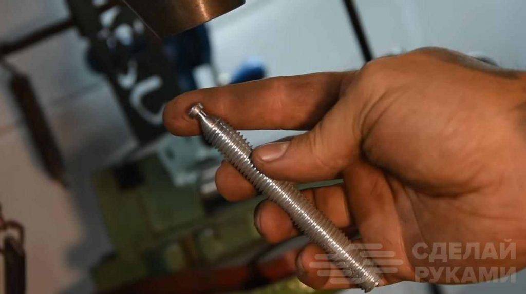 На следующем этапе необходимо будет отрезать кусок круглой трубы и заготовку из стального кругляка, которая входила бы в эту трубу. Также потребуется небольшой отрезок шпильки, из которой мастер изготавливает еще одну деталь.