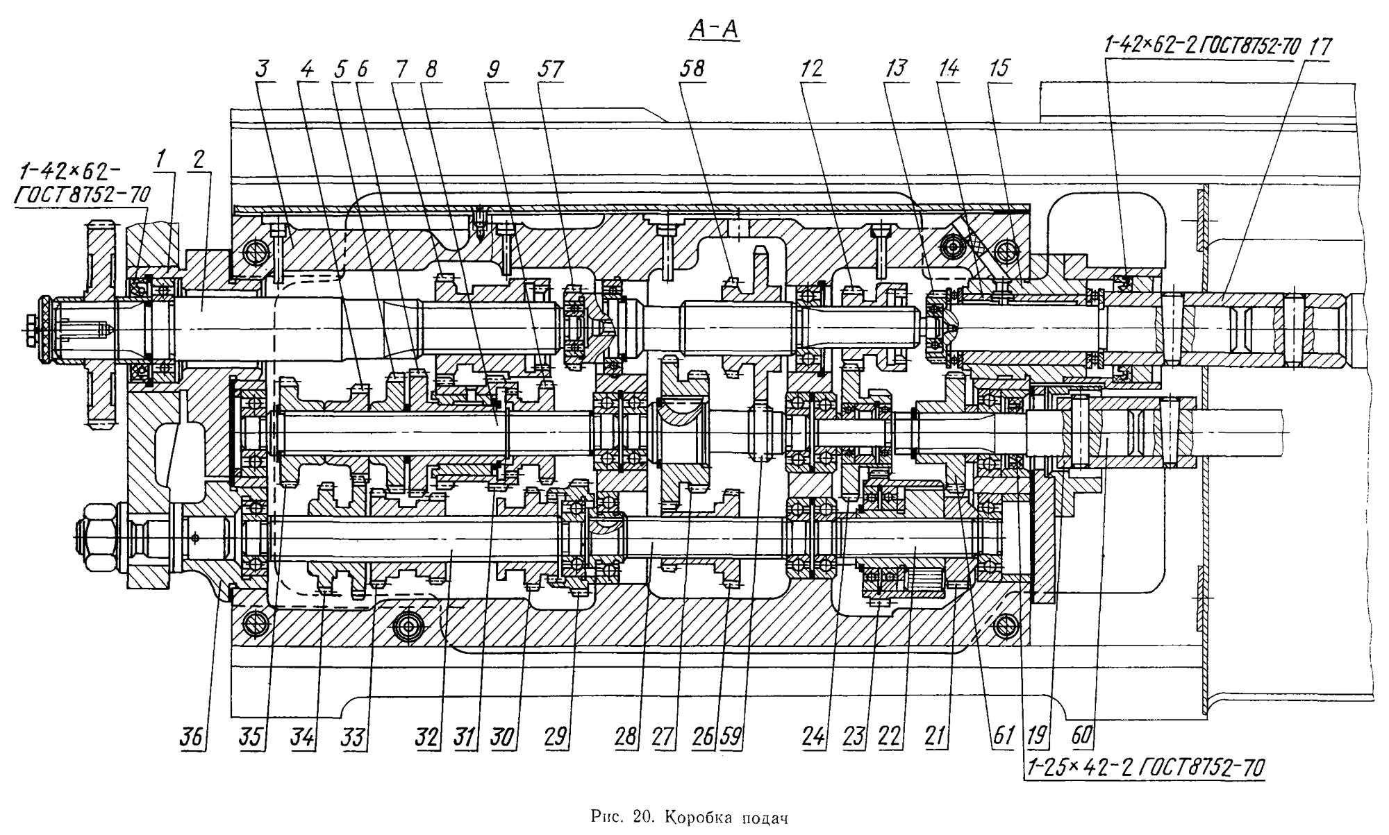 Коробка скоростей 16К20 обеспечивает шпинделю 11 обратных скоростей и 22 прямых (паспортные данные). При прямом вращении шпиндель имеет число оборотов от 12,5 до 1600, при обратном – от 19 до 1900. Шпиндель передает движение подачи на вал трензеля, после чего оно поступает на механизм подач – элементарная кинематическая схема, которая гарантирует безаварийную работу установки.