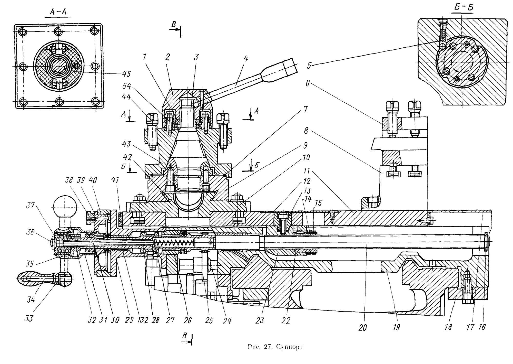 Примечание. Номерами, начинающимися со 100, обозначены детали, относящиеся только к суппорту с механическим приводом резцовых салазок. Числами меньше 100 — детали, унифицированные от суппорта с ручным перемещением резцовых салазок (рис. 27, 28).
