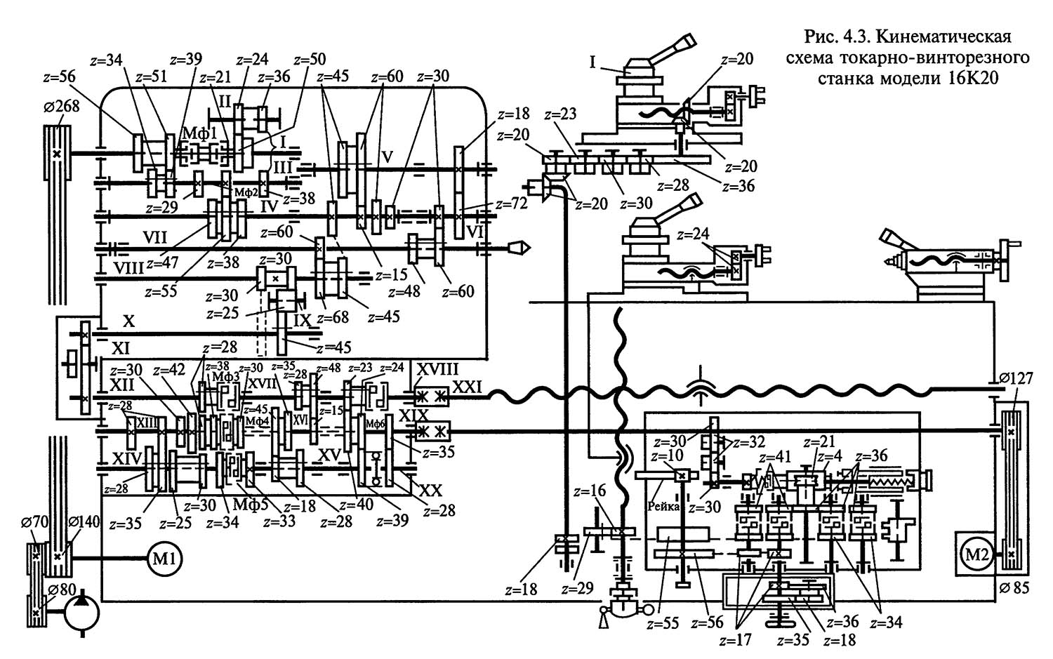 Токарный станок 16К20 имеет четыре разновидности, но общую кинематическую схему при этом: