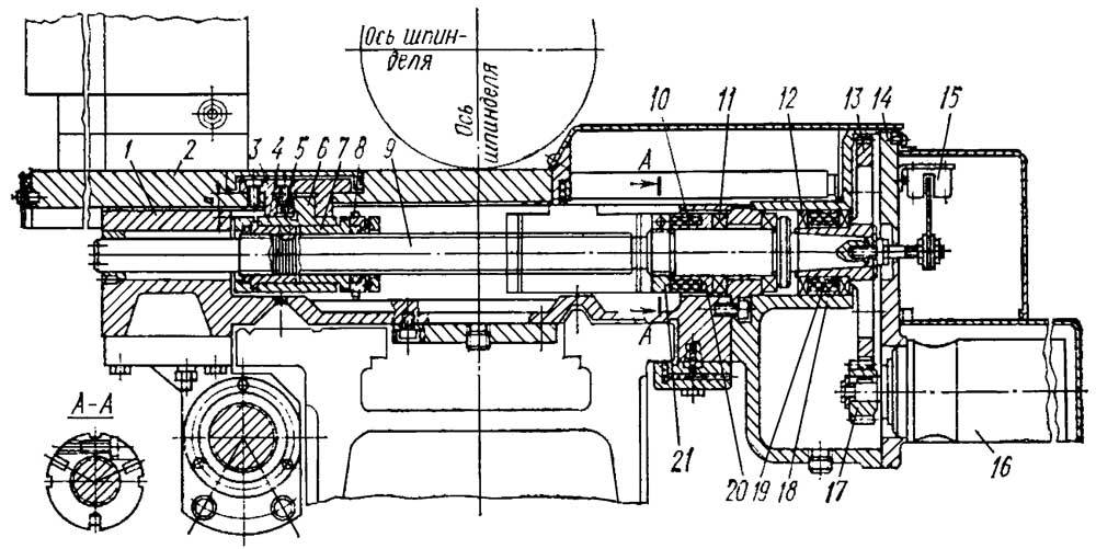Шпиндель станка смонтирован в коническом двухрядном и однорядном подшипниках. Подшипники регулируются на заводе-изготовителе станка и не требуют регулировки в процессе эксплуатации.