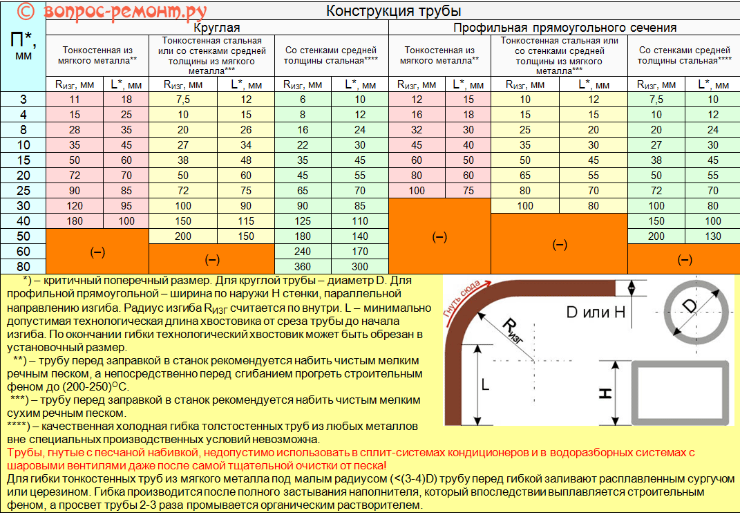 Нужно понимать, что способ и величина угла изгиба трубы зависит от ее характеристик. Имеется даже такая величина, как минимальный радиус изгиба, при дальнейшем снижении которого труба деформируется или просто рвется. Этот показатель зависит от толщины стенок, материала и сечения трубы.