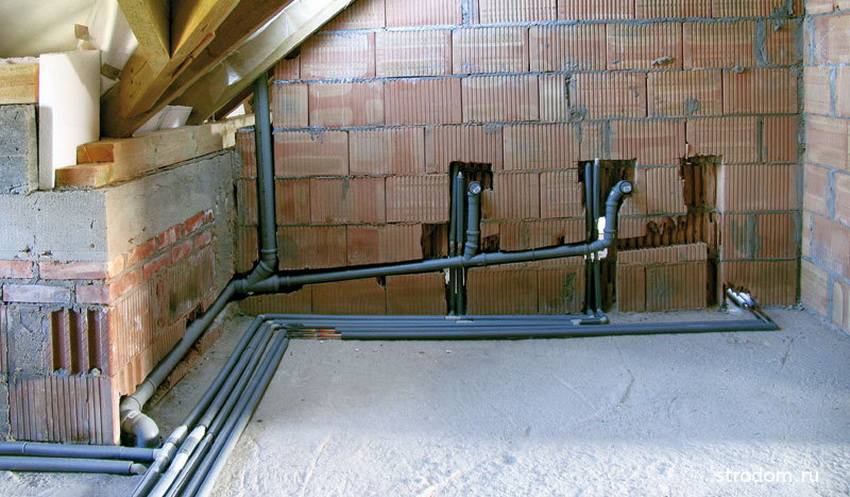 В ванной комнате и санузле трубы монтируются на цементную подушку. Система закрывается декоративными материалами, и эстетически пространство комнаты не страдает. При достаточной толщине стен трубы можно уложить в штробу, но этот вариант доступен далеко не всем.