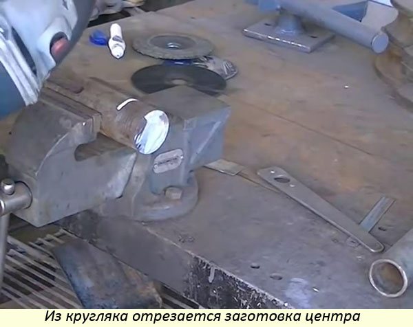 Сначала изготавливается центр. Для этого отпиливается небольшой фрагмент из кругляка. Заготовку фиксируют в тисках, размечают линию реза. С помощью отрезного диска и углошлифовальной машинки (УШМ) отпиливается заготовка.
