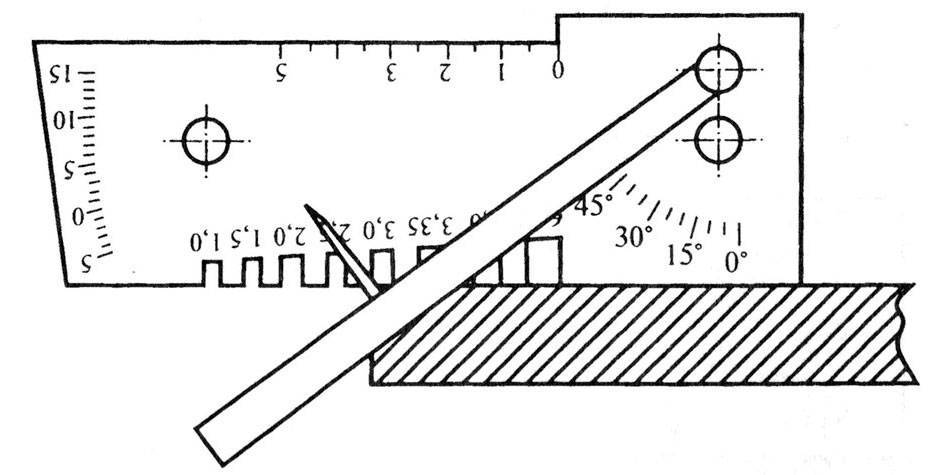 Угол разделки кромки деталей. В этом случае его располагают на поверхности детали верхом вниз. Движок опускают пока он не соприкоснется с плоскостью кромки. Значения считывают со шкалы вокруг оси вращения движка. При таком перевернутом положении шаблона она находится на его правой стороне.