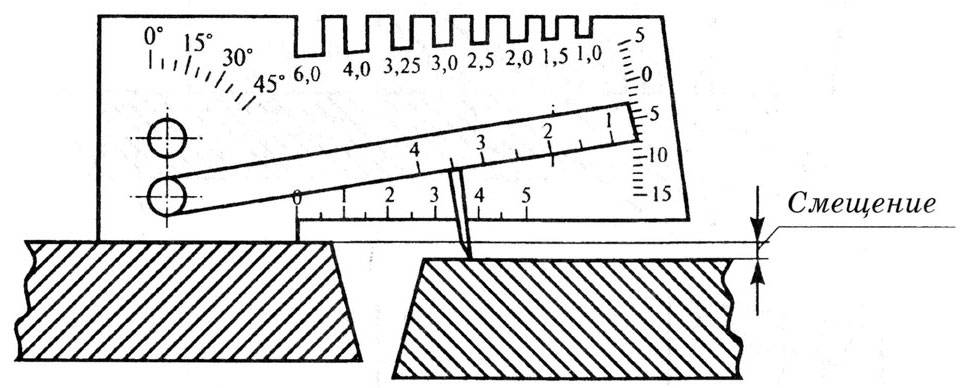Определение величины сдвигаемых скосов либо установочных кромок на соединенных сваркой деталях, необходимо установить шаблон, как указано на рисунке. Значение отсчитывается по указателю линейки Г.