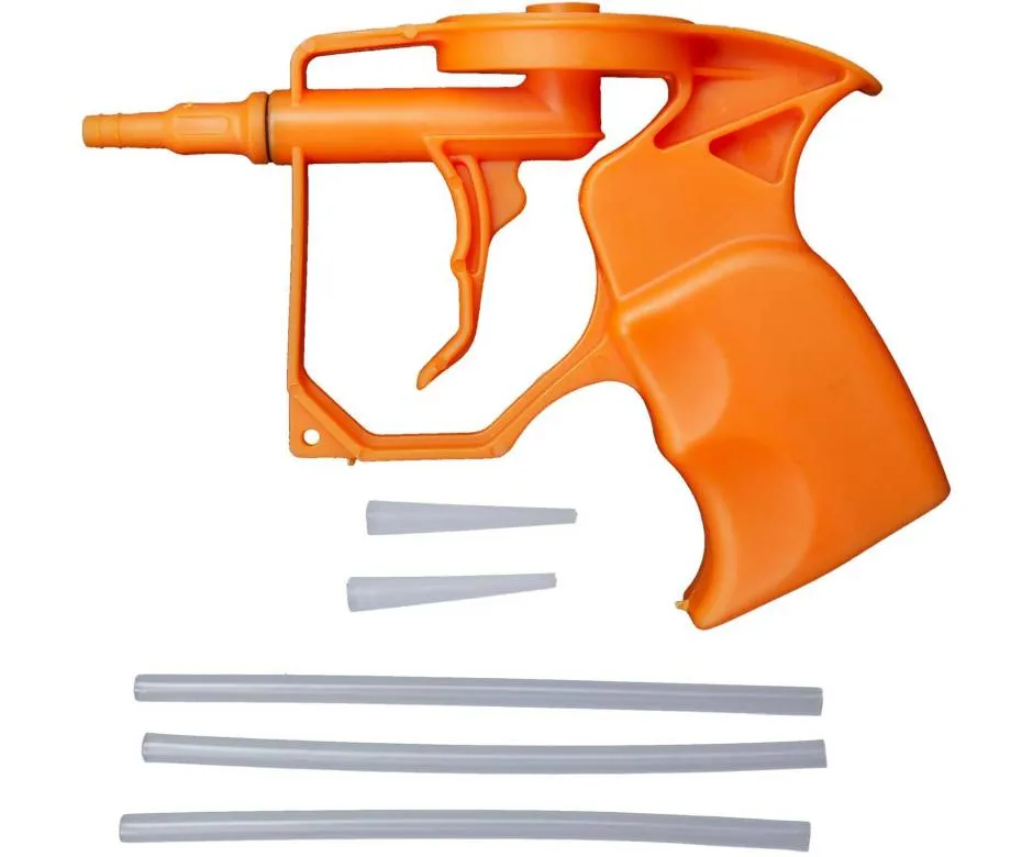 Есть пистолеты для работы с монтажной пеной без наконечника или со съемным соплом. В случае с первыми приходится отдельно закреплять специальную трубочку. Она входит в заводскую комплектацию.