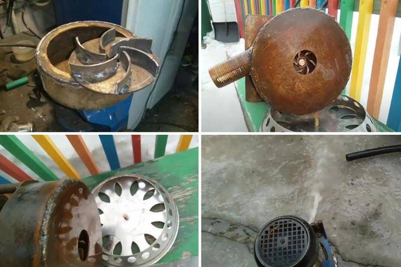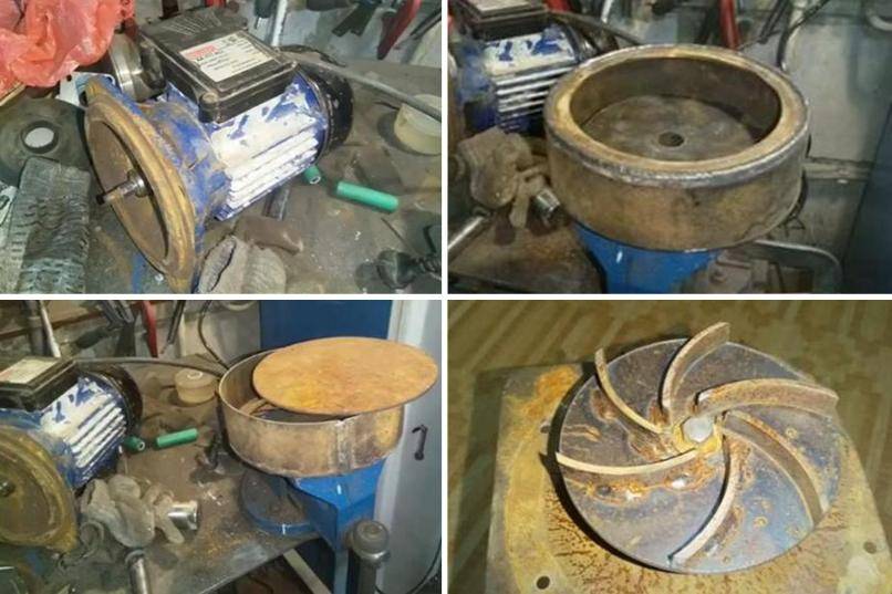 Основа крыльчатки – стальной диск диаметром 150 мм. Ее лопасти изготовлены из сегментов трубы большого диаметра. Высота лопастей – 14 мм. Для уплотнения отверстия в верхней крышке помпы, через которое проходит вал двигателя, между корпусом помпы и крыльчаткой установлено кольцо из фторопласта. Между уплотнительным кольцом и крыльчаткой находится мягкая пружина, которая прижимает уплотнение к корпусу помпы. На выход помпы приварен патрубок диаметром 42 мм.