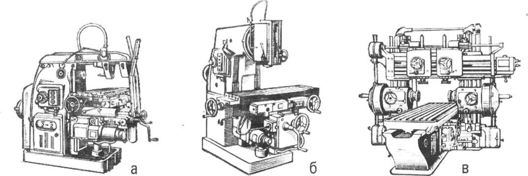 Универсально-фрезерный станок (рис2, а) консольной конструкции характеризуется горизонтальным расположением оси шпинделя, имеет хобот с подвеской для крепления оправки фрезы и предназначен для работы с разными типами фрез. Станок имеет поворотный (в горизонтальной плоскости) стол, что позволяет фрезеровать винтовые канавки; стол может перемещаться в продольном, поперечном и вертикальном направлениях. Горизонтально-фрезерный станок аналогичен универсально-фрезерному, но его стол не имеет возможности поворачиваться. Вертикально- фрезерный станок (рис., б) по конструкции близок к горизонтально- и универсально-фрезерным станкам, но отличается от них вертикальным расположением оси шпинделя. Продольно-фрезерный станок (рис., в) предназначен для обработки различных плоскостей у крупногабаритных заготовок (или их групп), установленных в многоместных приспособлениях на столе станка, главным образом торцовыми фрезами.