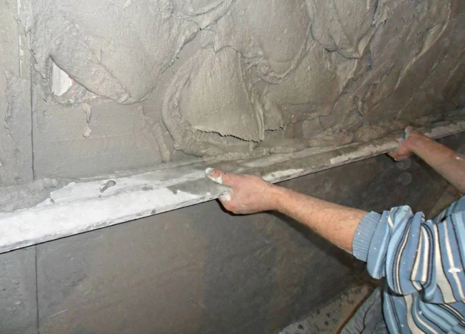 Следующий шаг – нанесение рабочего раствора на основание. Обычно процесс выполняется путем набрасывания с помощью мастерка. Специалисты с целью ускорения процесса пользуются строительным ковшом. Формирование слоя происходит начиная снизу. Так оседающую под собственным весом штукатурку проще будет правилом своевременно убирать со стен.