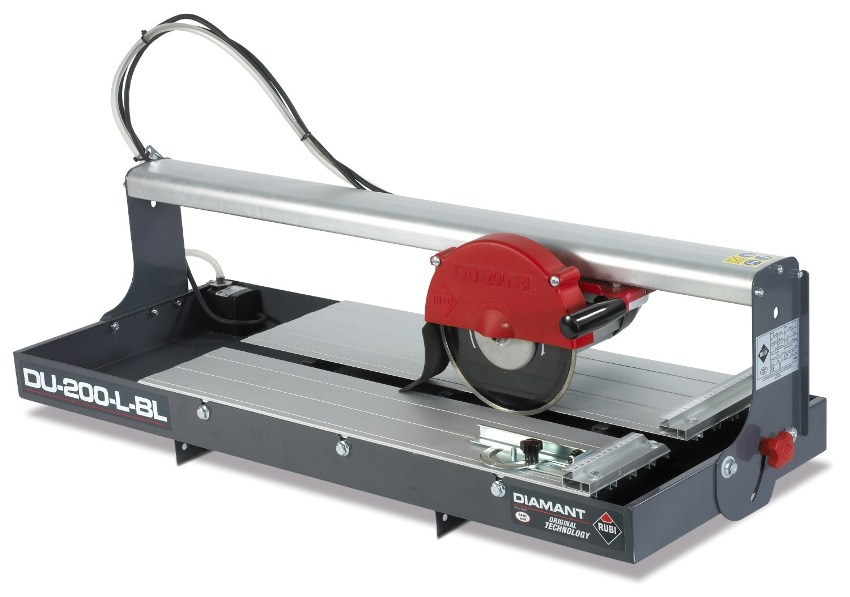 Электрический станок для резки плитки популярен из-за функциональности. Имеется возможность резать под углом, каретка регулируется по высоте. Для плитки предусмотрены надежные фиксаторы. Плиткорез оснащен мотором мощностью 1,5 кВт. Максимальная длина реза – 900 мм. Под углом 42 и 45о глубина пропила достигает 60 мм. Инструмент считается профессионального направления.