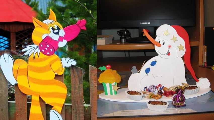 Давайте рассмотрим сначала, что можно выпилить из фанеры. Это могут быть крупные фигурки для сада и огорода, например крыса, убегающая от кота, зайчик, засевший посреди клумбы, фигурки сказочных Чебурашки и крокодила Гены, играющего на гармошке. Их можно установить на длинный брусок и закопать в саду.
