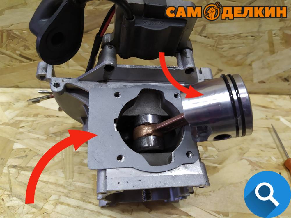 - Для смазывания поршня необходимо открутить свечу зажигания, поднять поршень до мертвой точки с помощью стартера, налить немного масла в отверстие для свечи зажигания и несколько раз повернуть коленчатый вал;