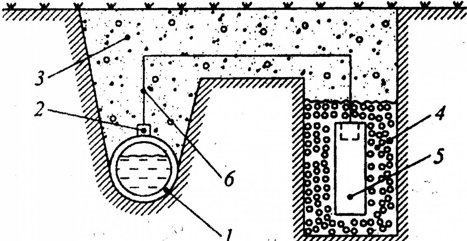 1 – стальной провод с изоляцией; 2 – грунт; 3 – выпрямитель; 4 – засыпка; 5 – вспомогательный анод; 6 – защищаемая конструкция (трубопровод).