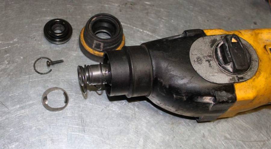 - SDS зажим разбирают по определенной схеме — сначала удалить шарик, потом шайбу, в последнюю очередь пружину.